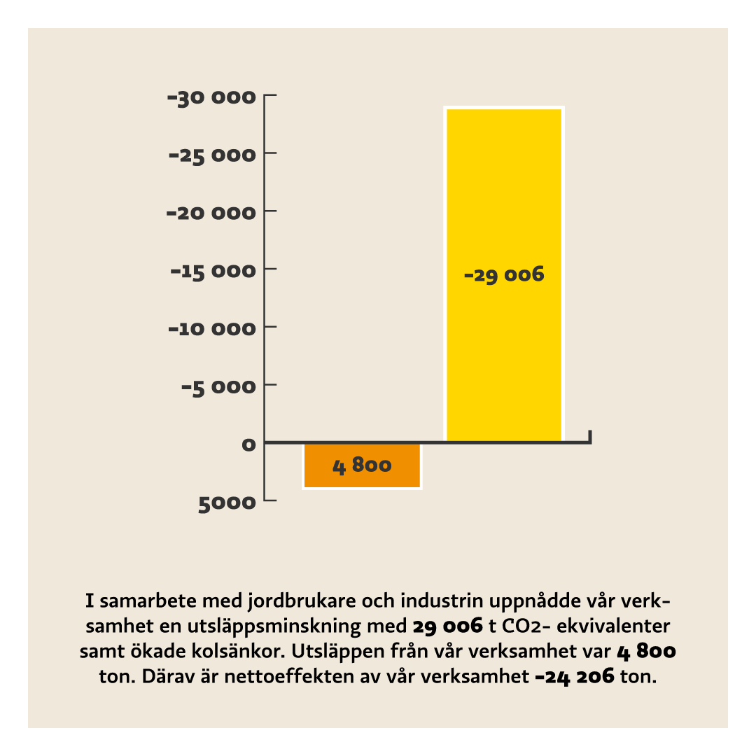 Genom vårt samarbete har vi uppnått utsläppsminskningar på 29 006 ton CO2-ekvivalenter. När utsläppen från Soilfoods egen verksamhet dras av blir nettoeffekten 24 206 ton. Det motsvarar cirka 4 665 svenskars årliga koldioxidavtryck, berättar Sampo Järnefelt.