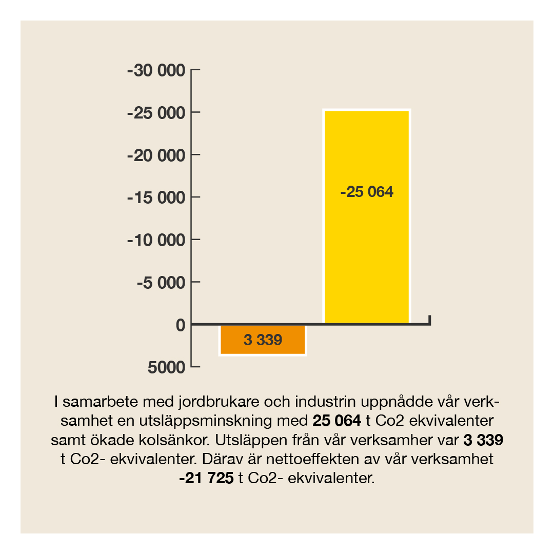Soilfoods samarbete med jordbrukare och industrier ledde förra året till minskade koldioxidutsläpp på 25 064 ton och en ökning av mängden bundet kol (kolsänkor). Vår egen verksamhet genererade utsläpp på 3 339 ton, vilket ger en nettominskning på 21 725 ton koldioxid från vår verksamhet.